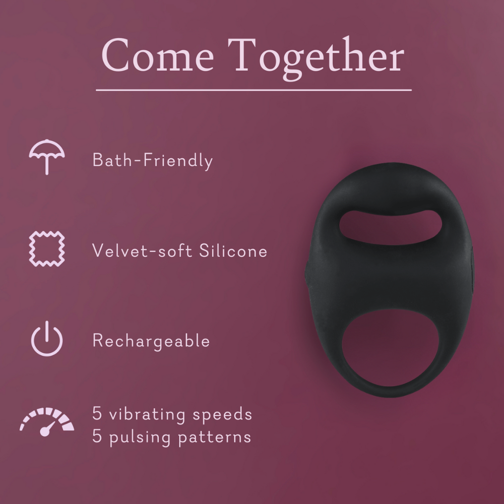 Where all else fades away, indulge in shared pleasure with Come Together, a truly unique couples toy that tantalizes the two of you at the same time. The first of its kind, this c-ring's floating motor puts powerful sensation close to your clitoris. And for them? Decadent pressure gives your partner full control for lasting pleasure that'll make your night together anything but ordinary. Enjoy the Silence Featuring exclusive floating motors. This patented technology puts ultra-penetrating but quiet vibration where you desire it most. Every uninhibited pulse and vibration travels through the body, yours, not the toy's, for deeper, more powerful sensation.